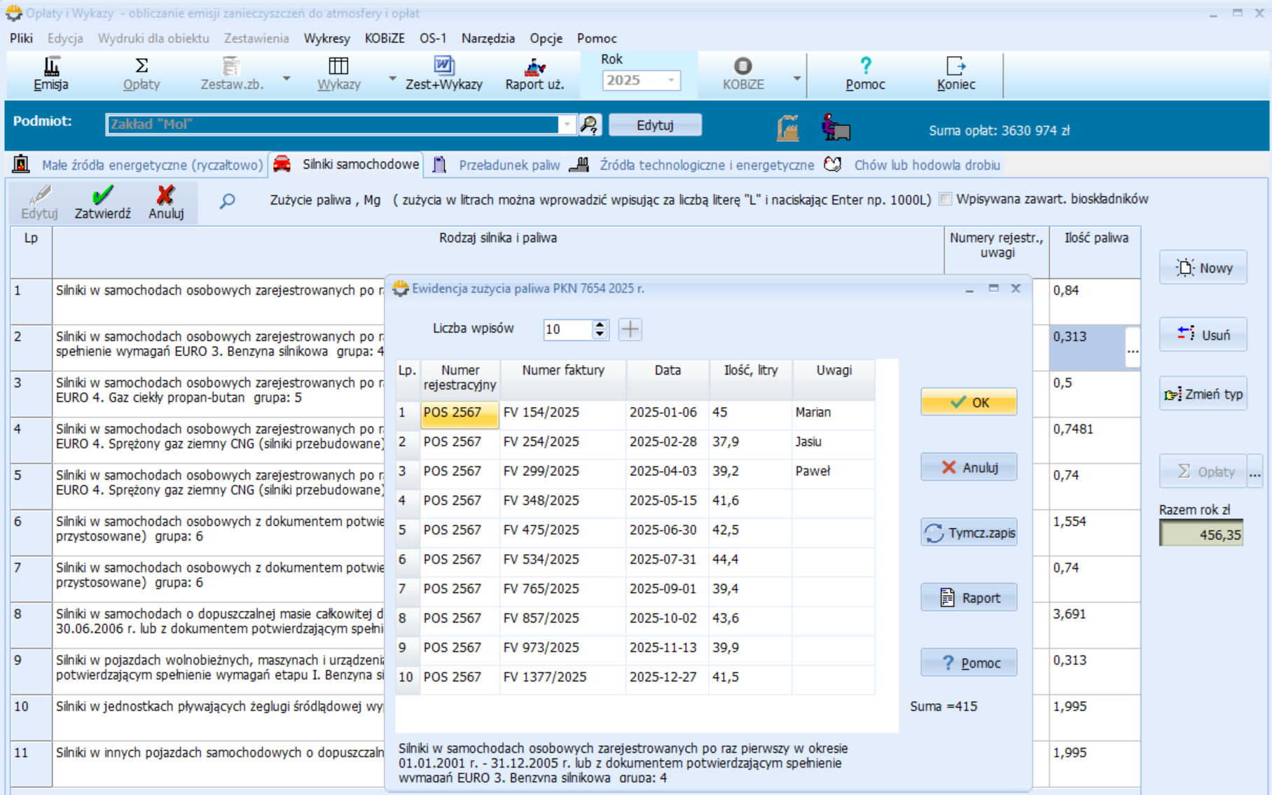 Oblicza opłaty za emisję zanieczyszczeń oraz opłaty ryczałtowe za spalanie energetyczne, w silnikach samochodowych, przeładunek paliw i hodowlę drobiu.
