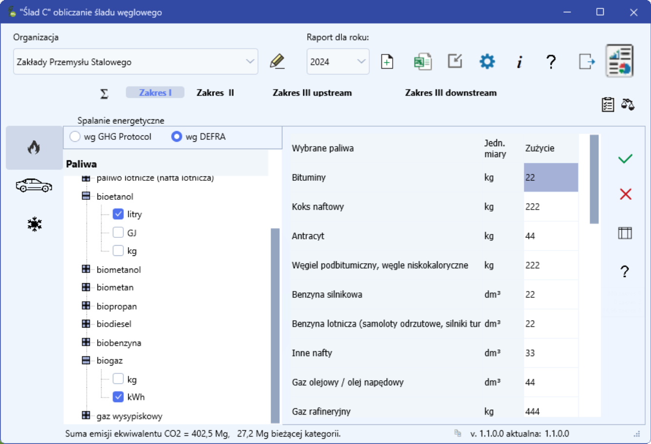 1. Do bazy programu zostało dodane ponad 200 wskaźników emisji spalania z opracowania DEFRA. Widok okna. 2. Raport tekstowy i raport do xlsx zawiera w przypadku spalania numer źródła wskaźników, a raport do xlsx dodatkowo link. 3. W oknie do wprowadzania danych spalania został dodany przycisk generujący arkusz w Excelu zawierający wyliczenie emisji ze spalania ze wszystkimi danymi, wskaźnikami i wzorami.