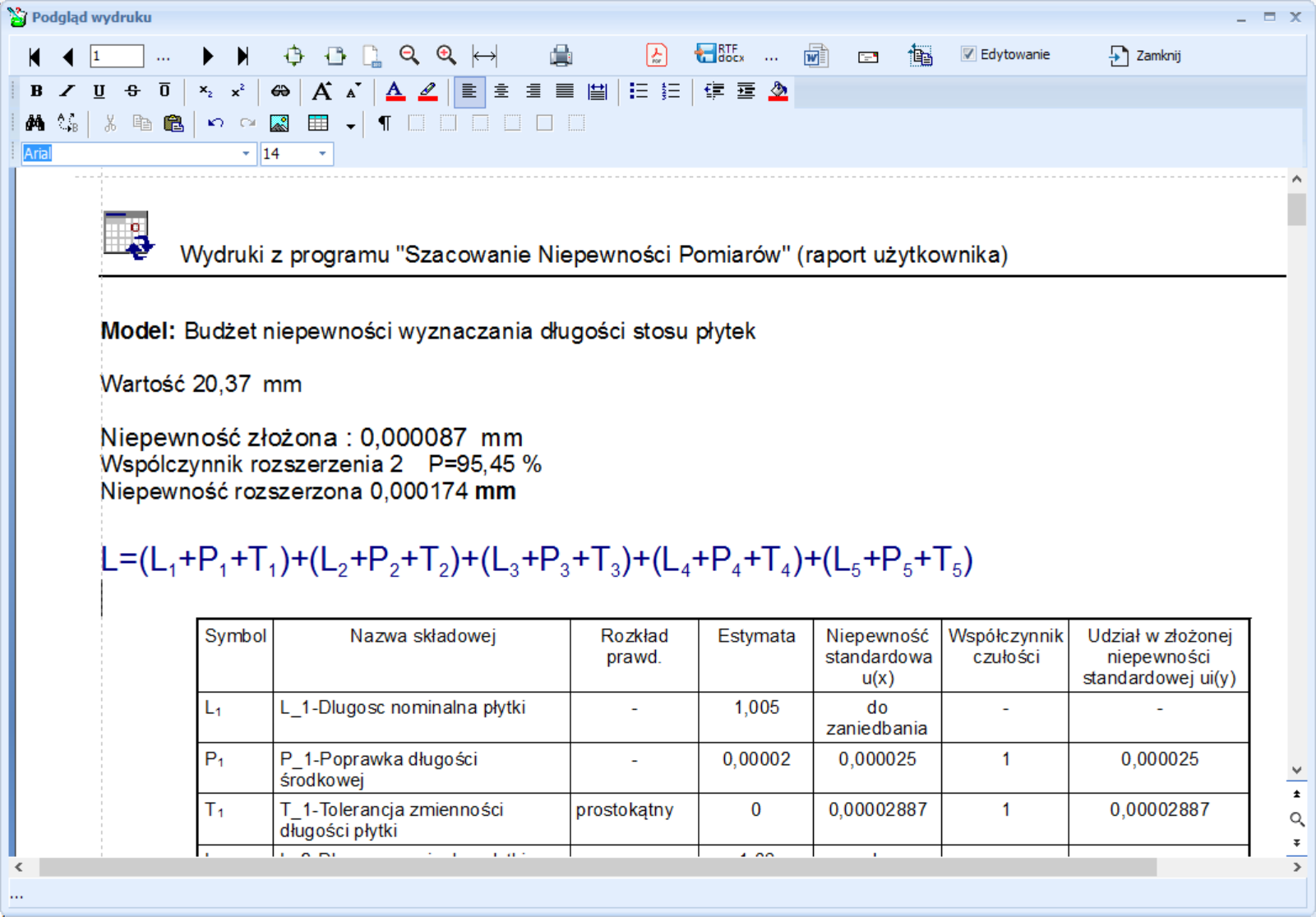 | 5 grudnia 2007 r. | Dodany wydruk tabeli niepewności złożonej dla szeregu wartości i niepewności jednej ze składowych . Obliczenie jest możliwe przy przy założeniu, że niepewności pozostałych składowych nie zależą od wpisywanej wartości. |