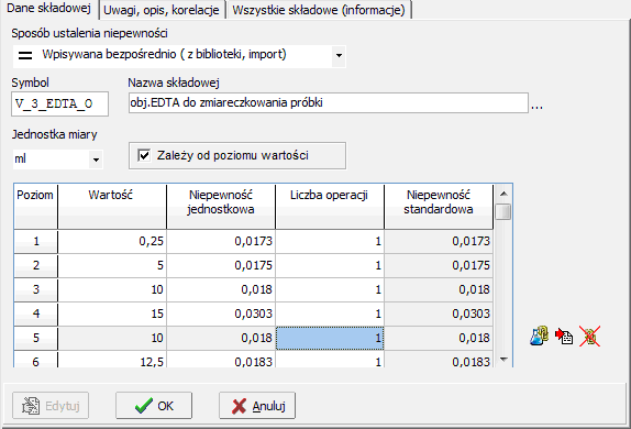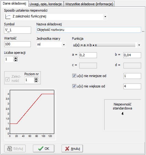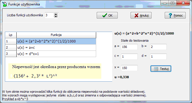 | marzec 2011 r. | Dodano możliwość wprowadzenia definiowanych przy użytkownika zależności funkcyjnej niepewności od wartości składowej . Widok okna |