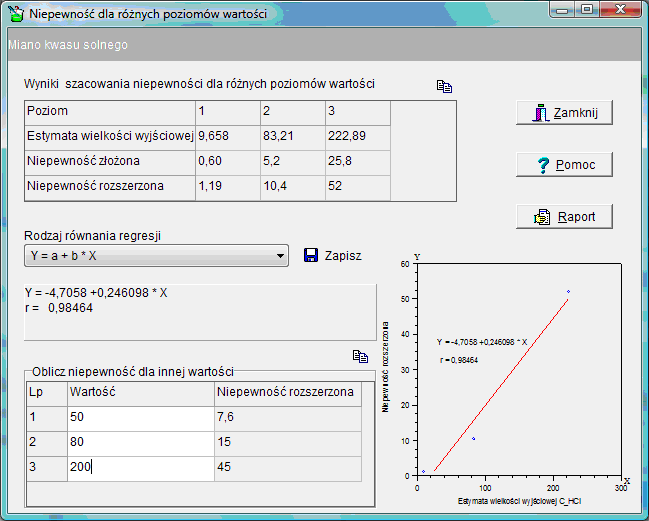 | 11 lutego 2008 r. | Można wpisać w jednym modelu dane dla kilku poziomów wartości, sprawdzić korelację między estymatami wielkości wyjściowej i niepewnościami oraz oszacować niepewność dla innych wartości na podstawie wybranego równania regresji. Widok okna obliczeń dla innych wartości |