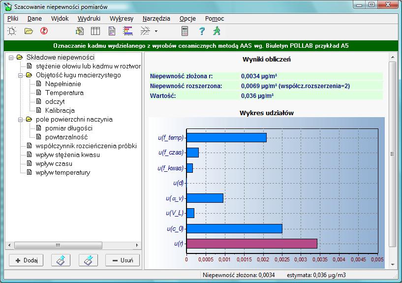 | 13 lutego 2006 r. | W panelu danych po kliknięciunapisu "Składowe niepewności" lub po odczycie modelu, wyświetlane są informacje o wynikach i wykres udziałów niepewności poszczególnych składowych. Zestawienie jest aktualizowane na bieżąco po zmianie danych. Widok okna |